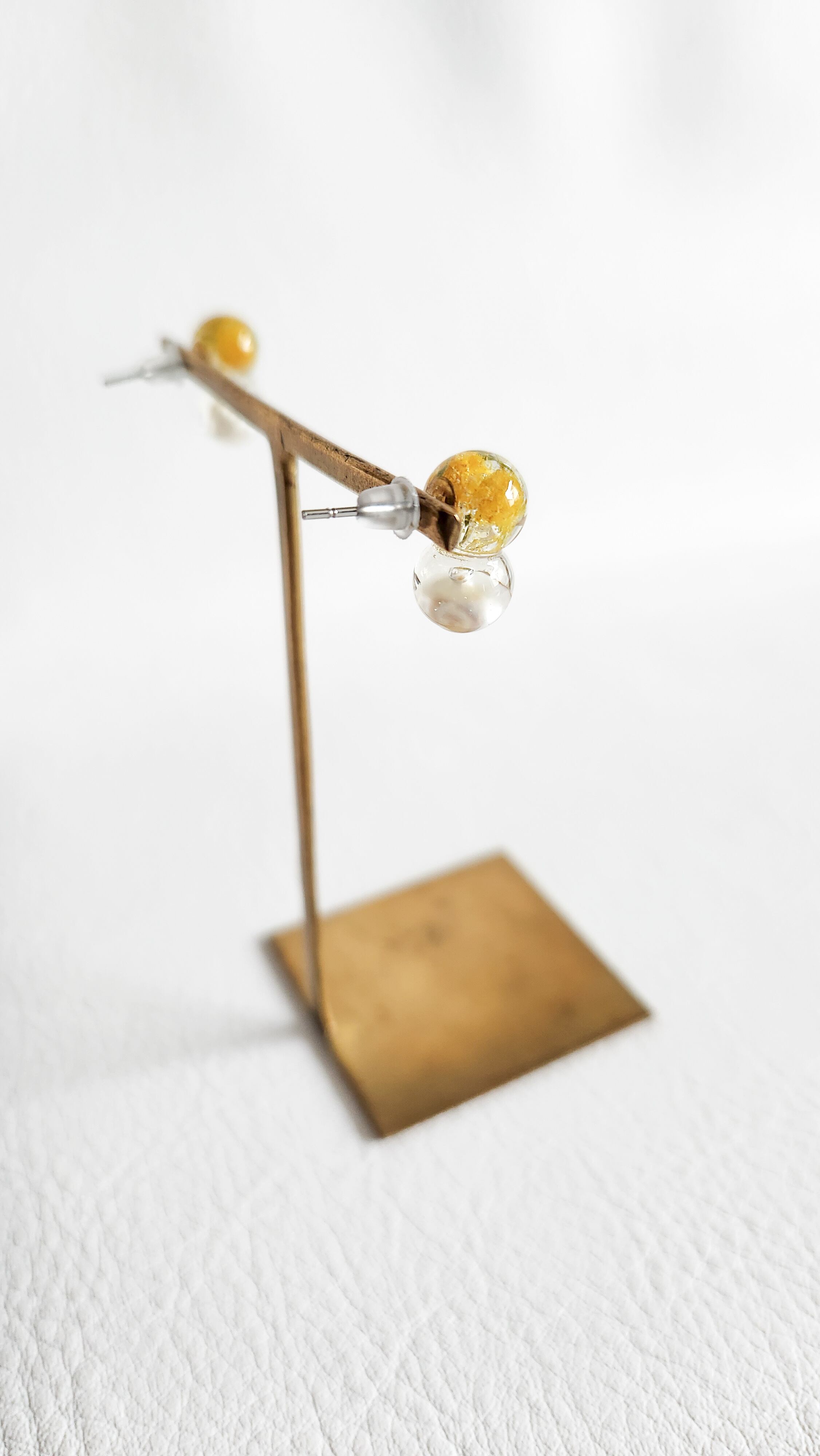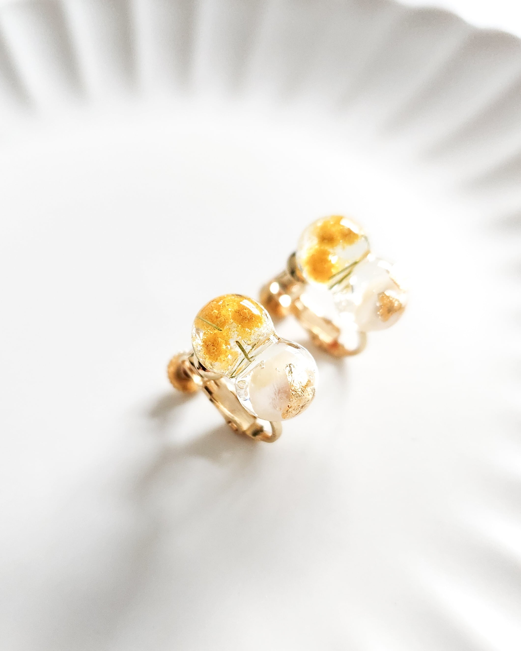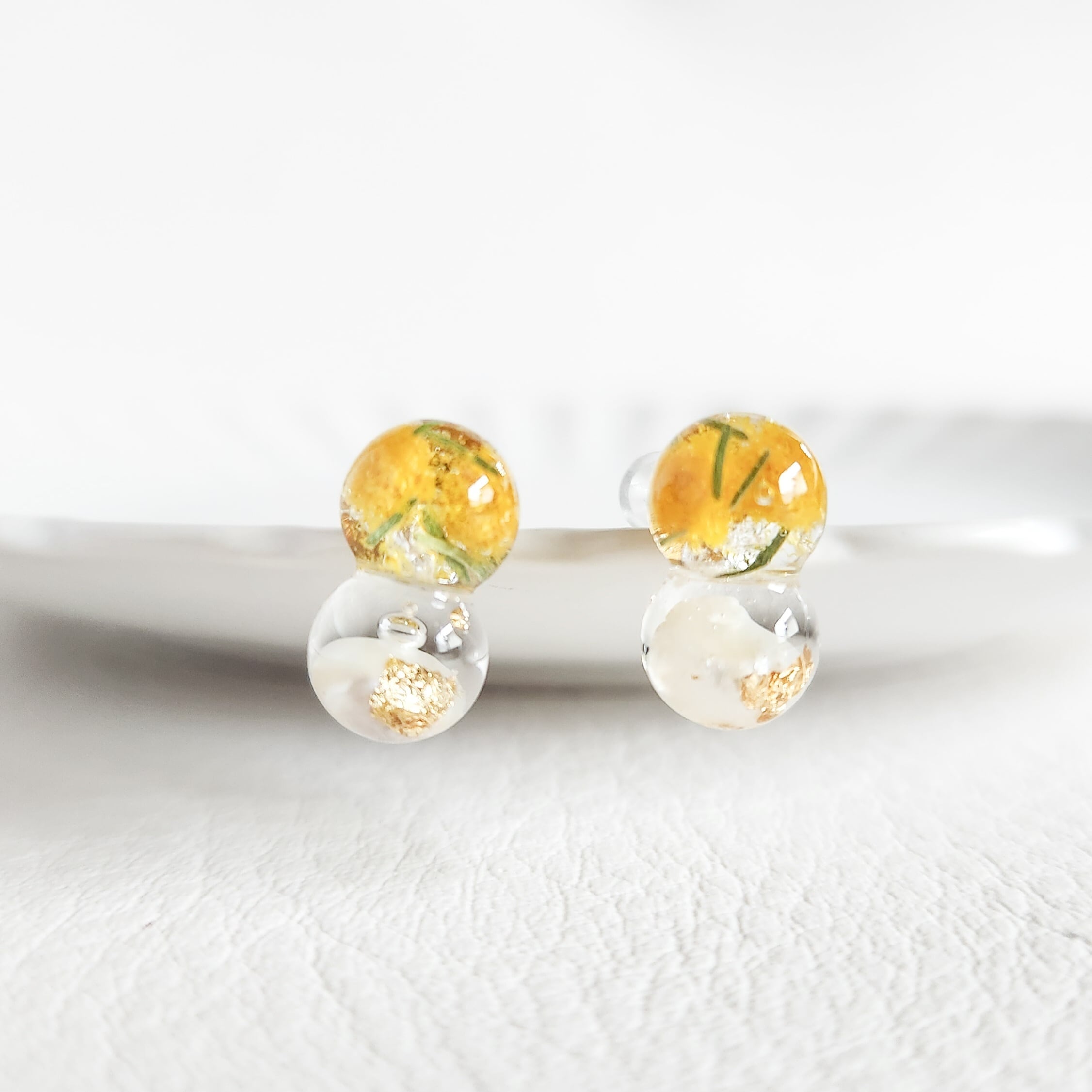 ミモザの小さなかわいらしい花を閉じ込めて耳飾りにしました。