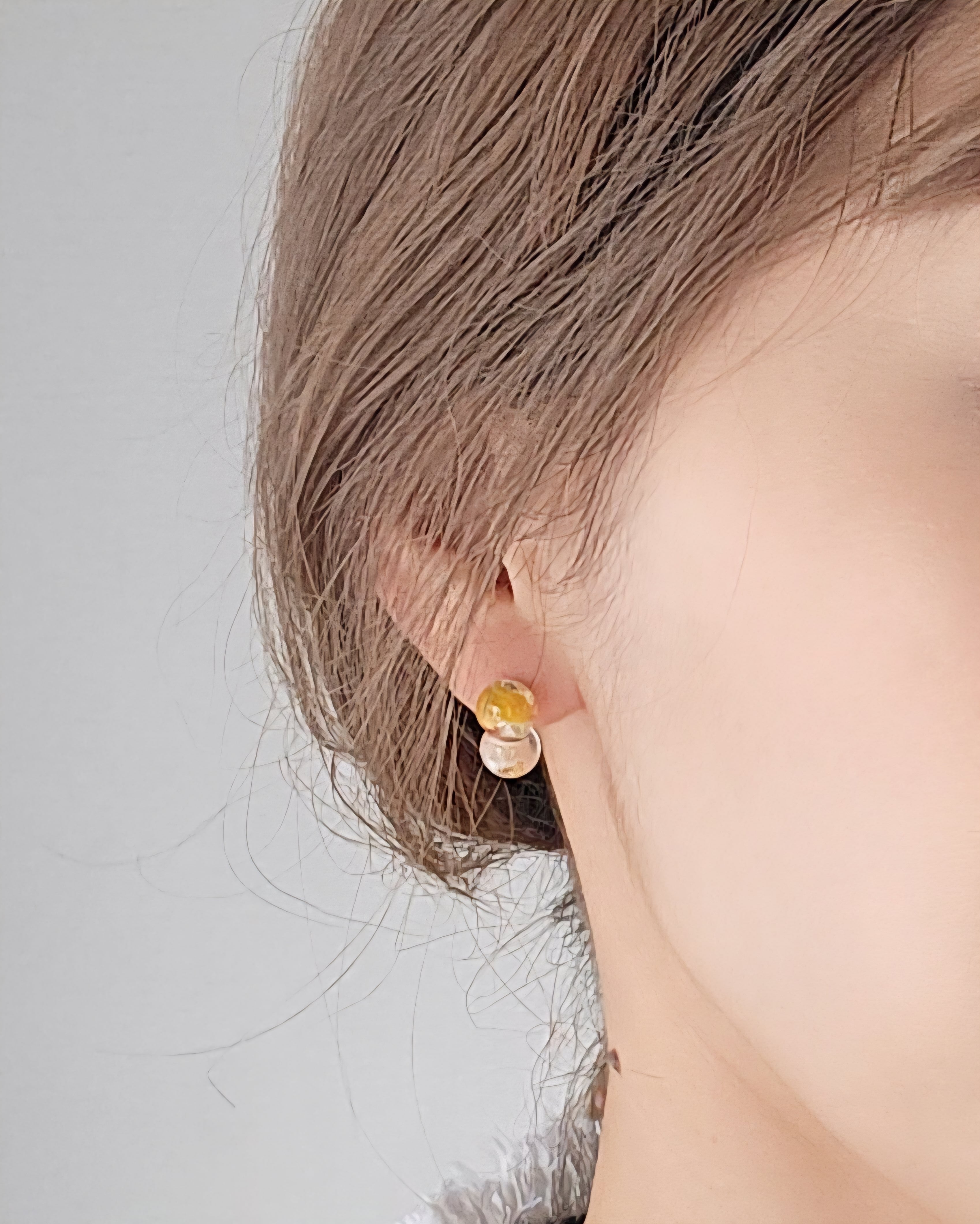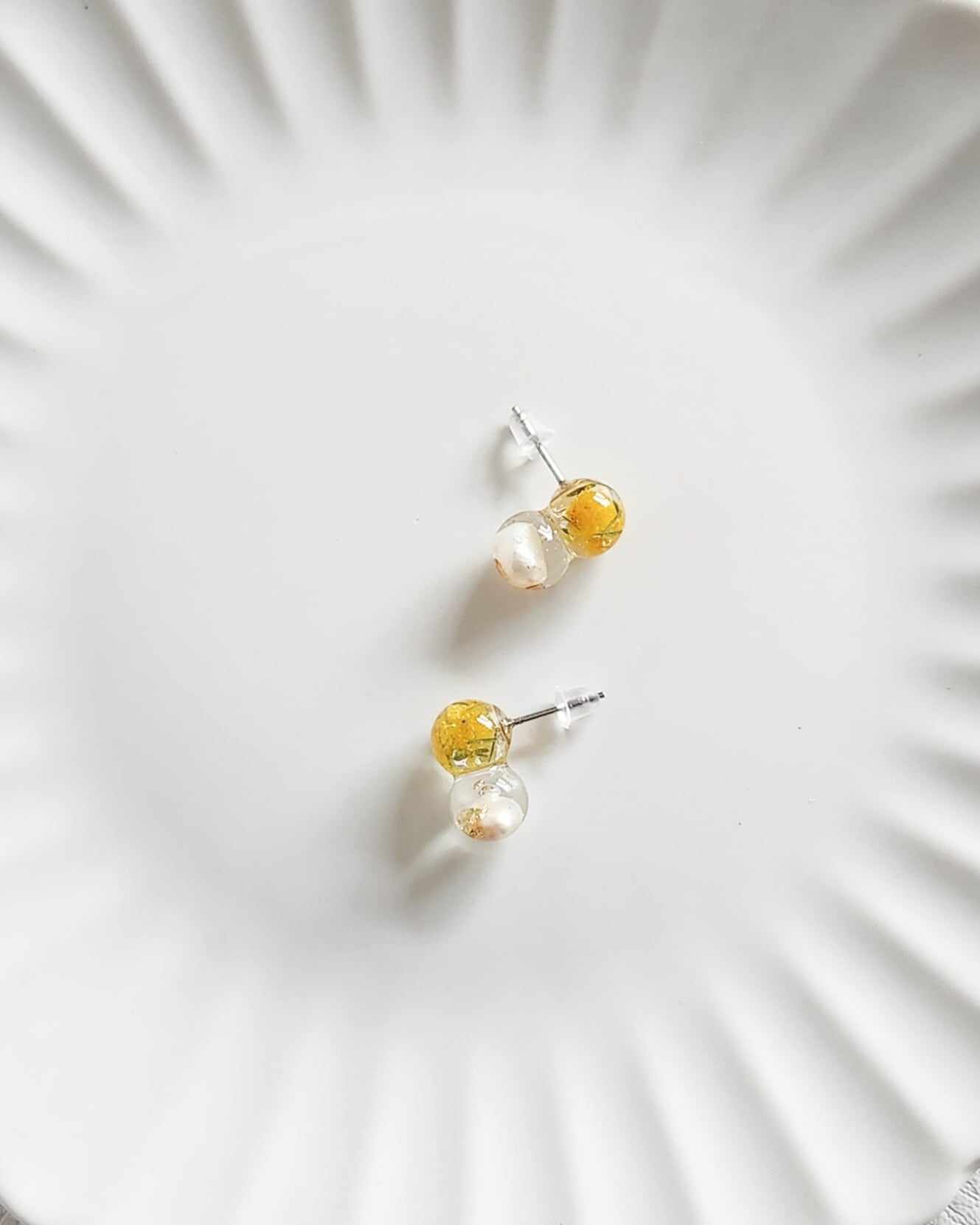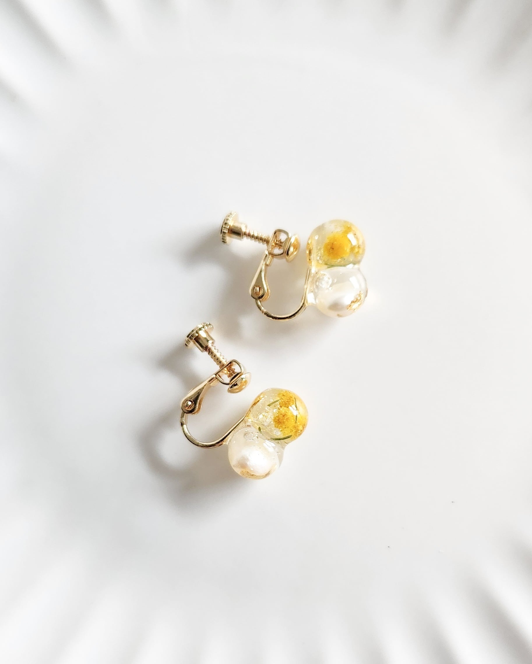 ミモザの小さなかわいらしい花を閉じ込めて耳飾りにしました。