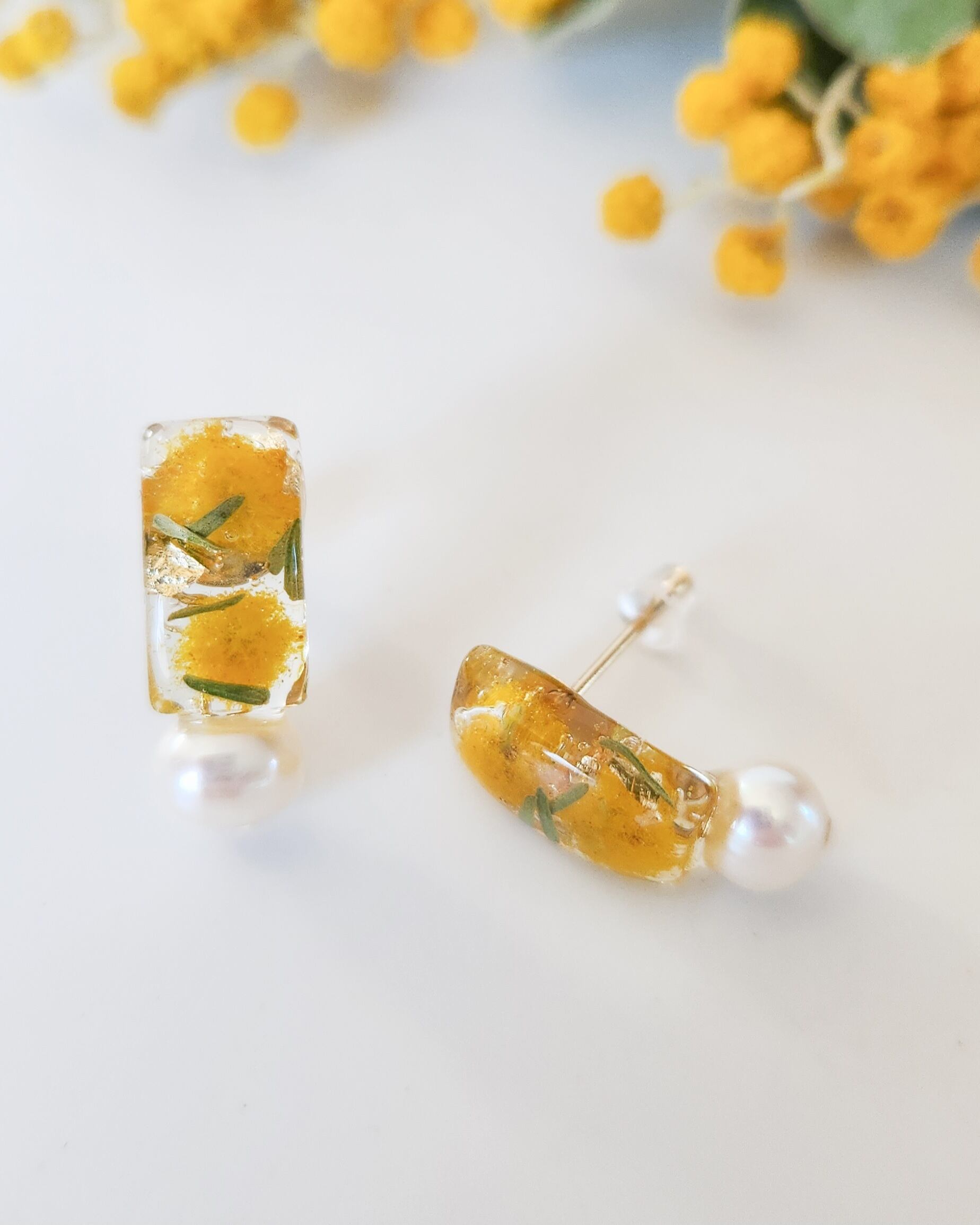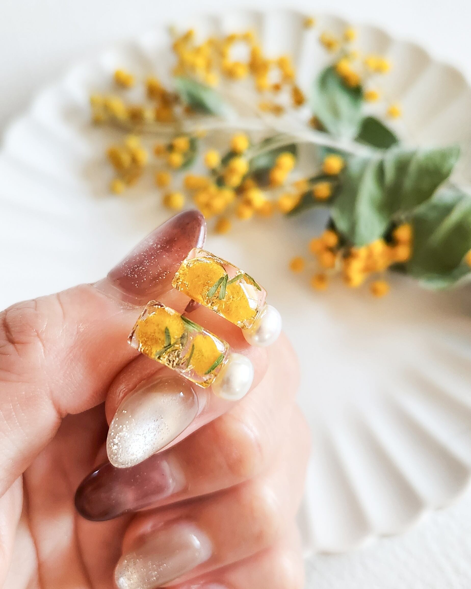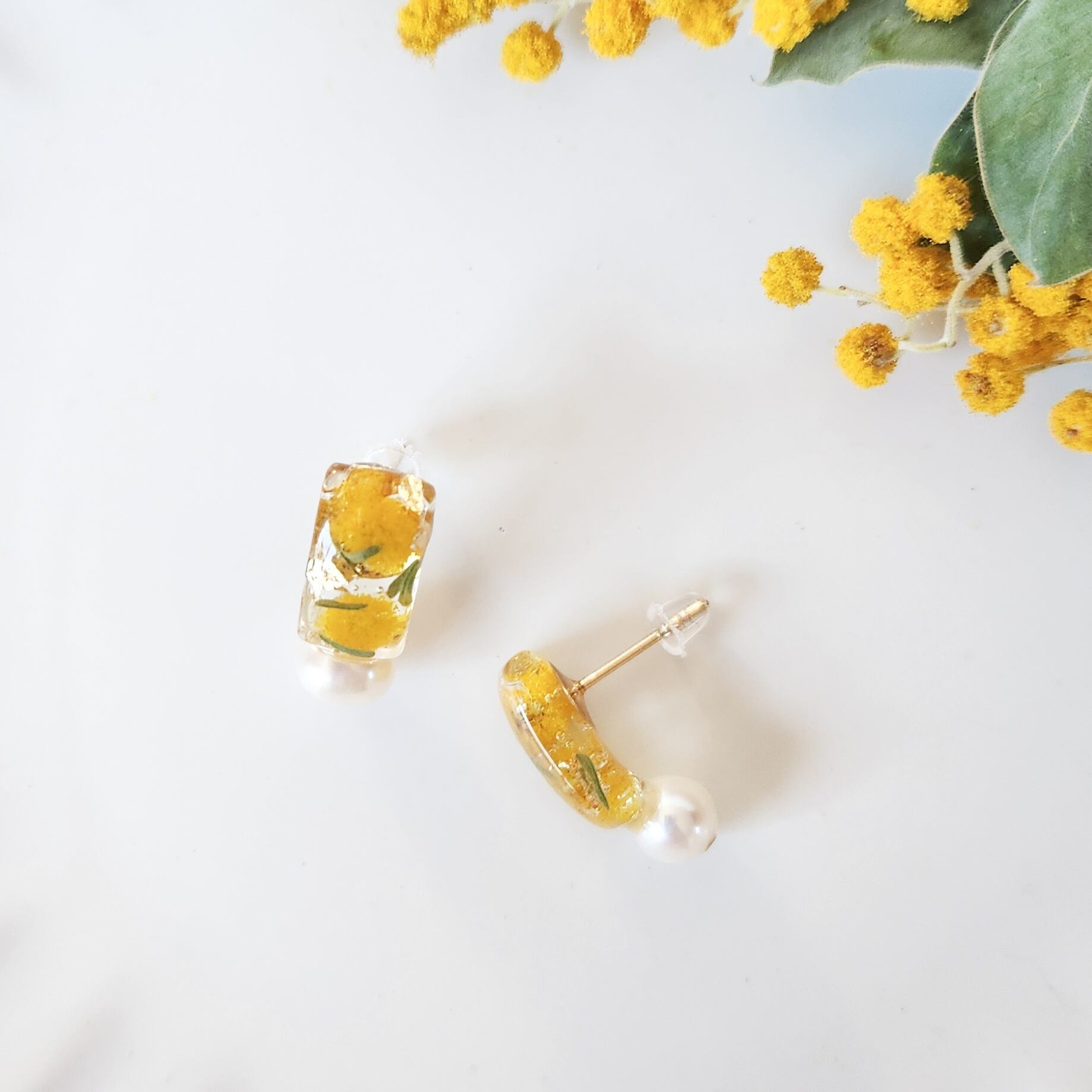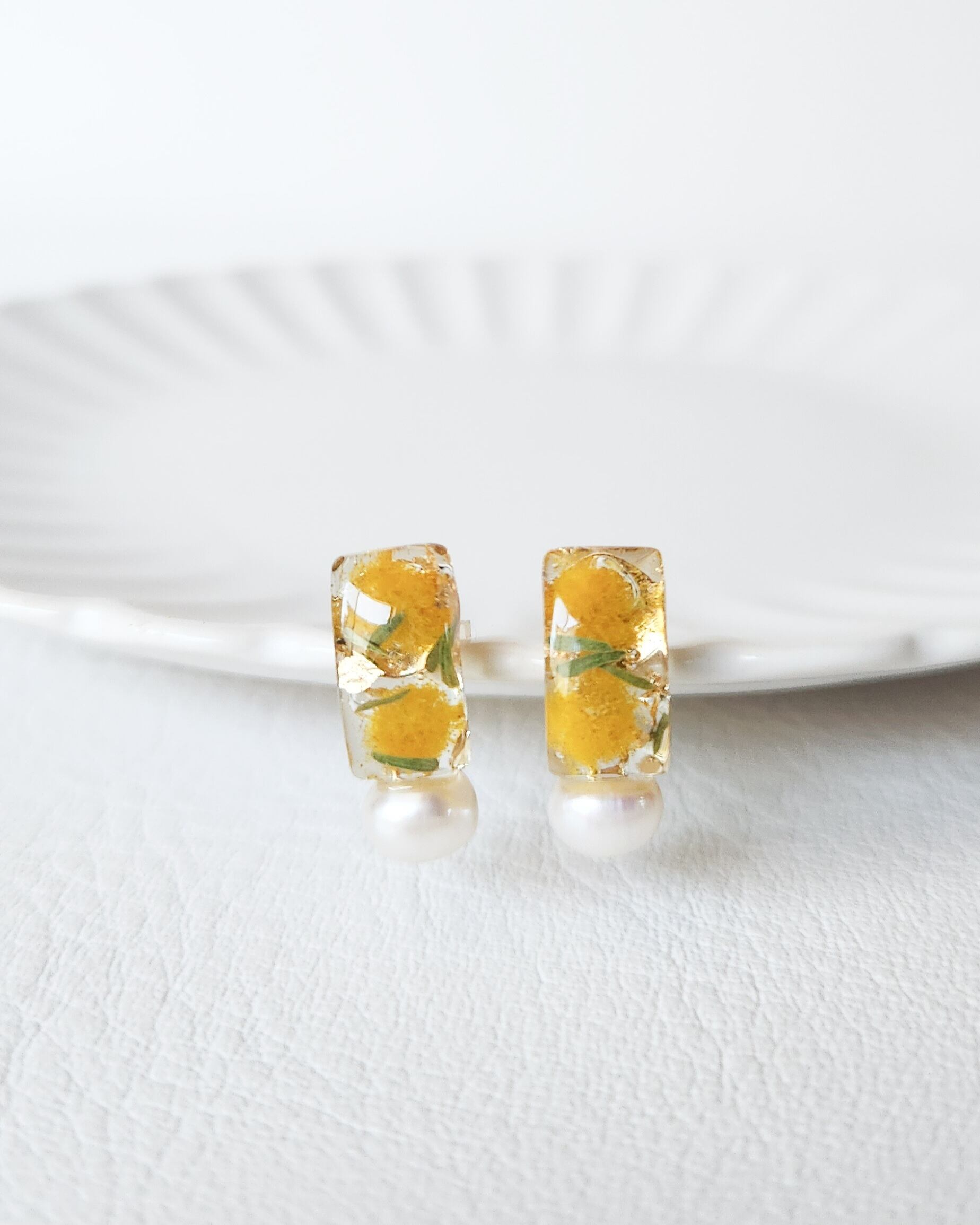 本物のお花(ミモザ)/淡水パール(約6mm)/樹脂/金具(メッキ)