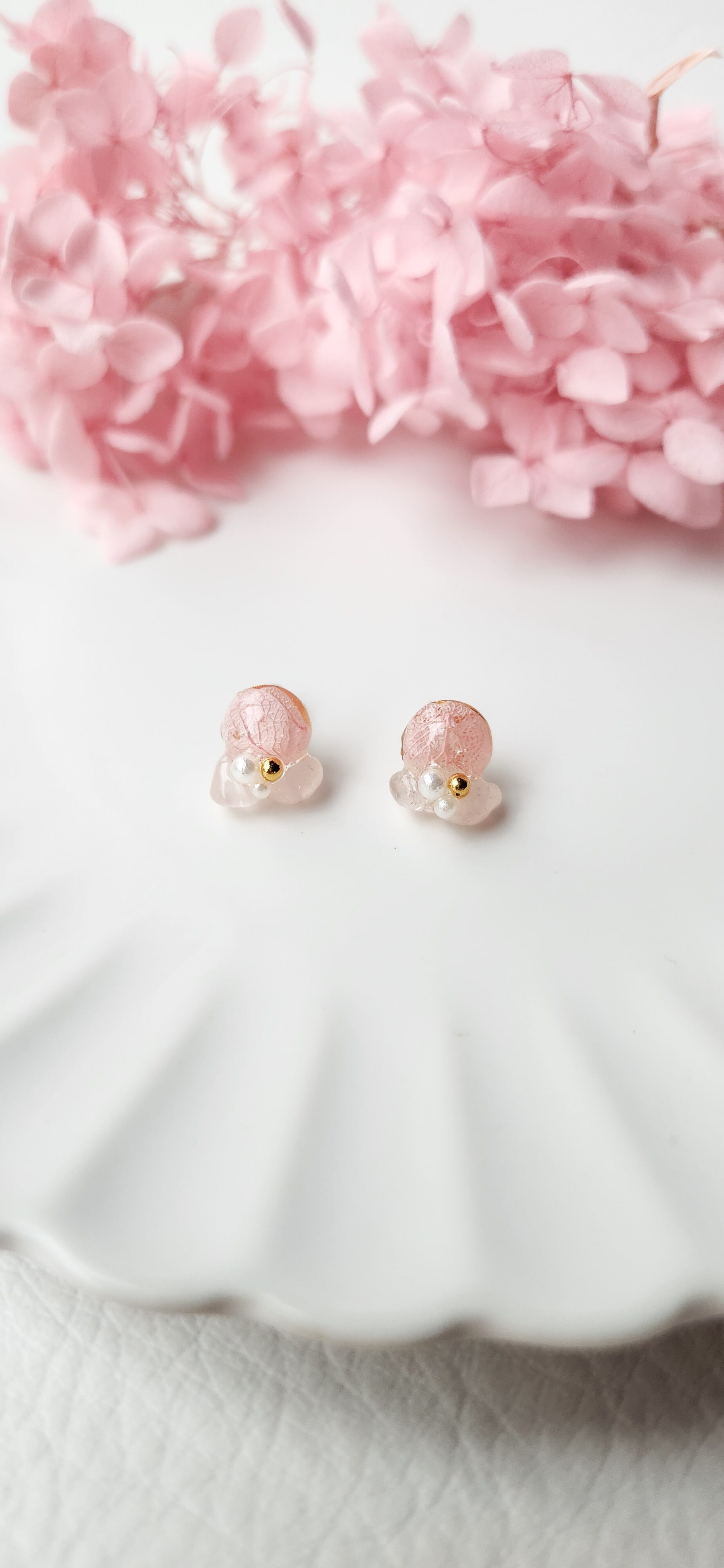 【素材】天然石 ローズクォーツ/紫陽花(プリザーブドフラワー)/ブリオン/樹脂/サージカルステンレスピアス/イヤリング(メッキ)