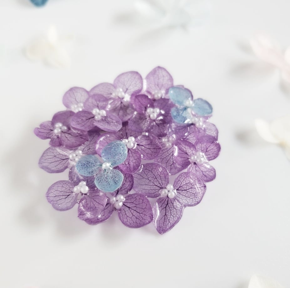 紫陽花のプリザーブドフラワーをレジンで加工し、花びらを重ねたお品です。