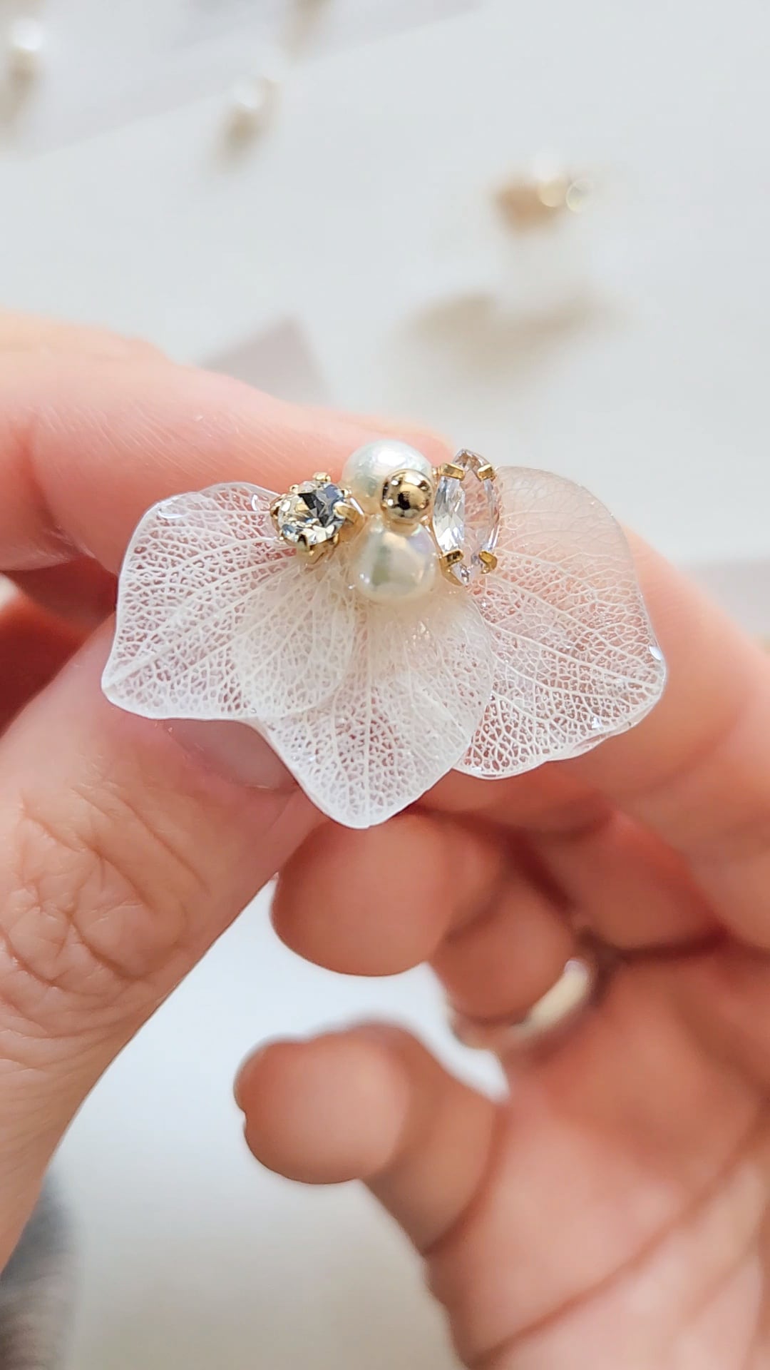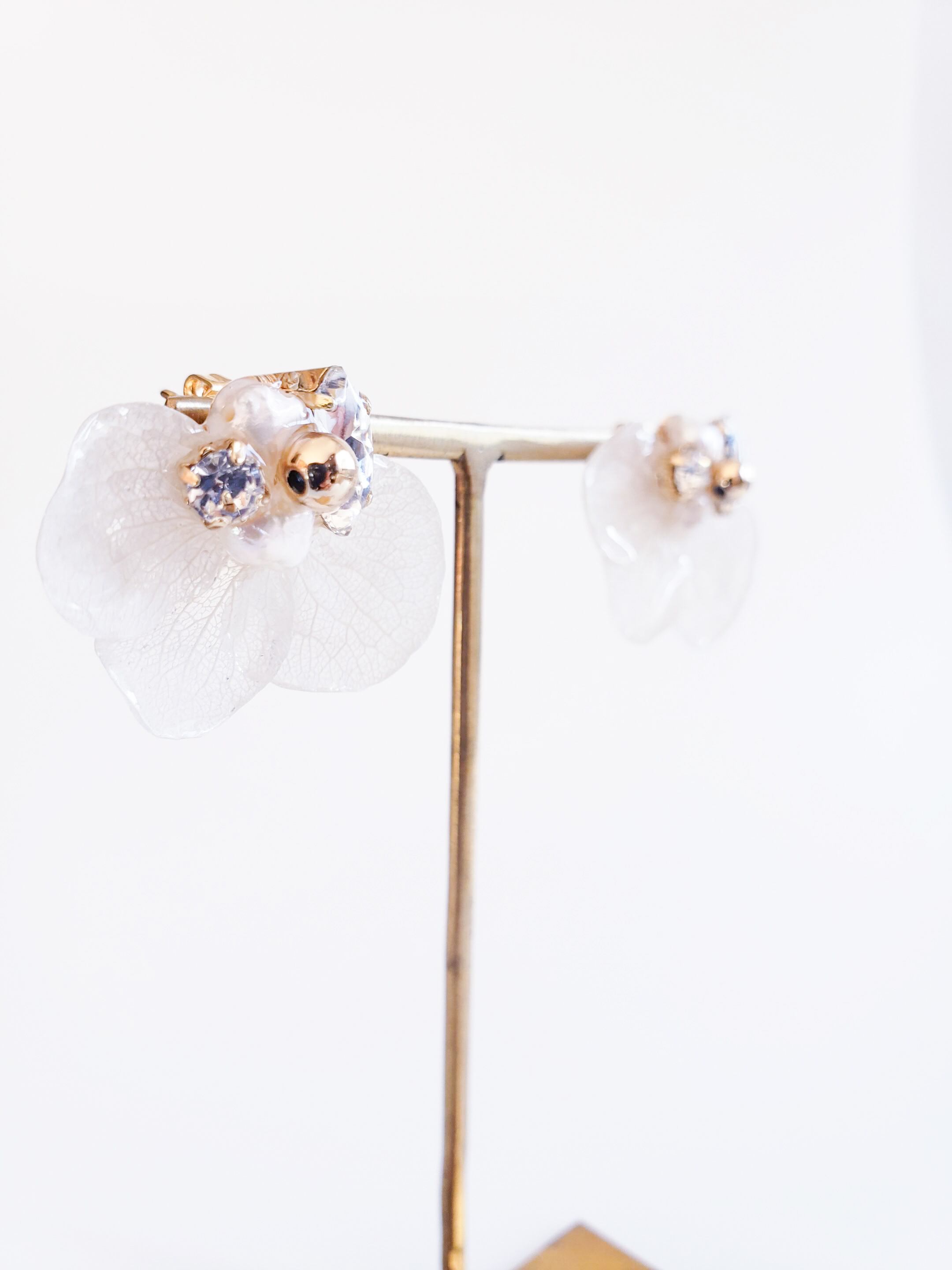 本物のお花(紫陽花)と淡水パール、クリスタル、ビジューを使用した耳飾りです。