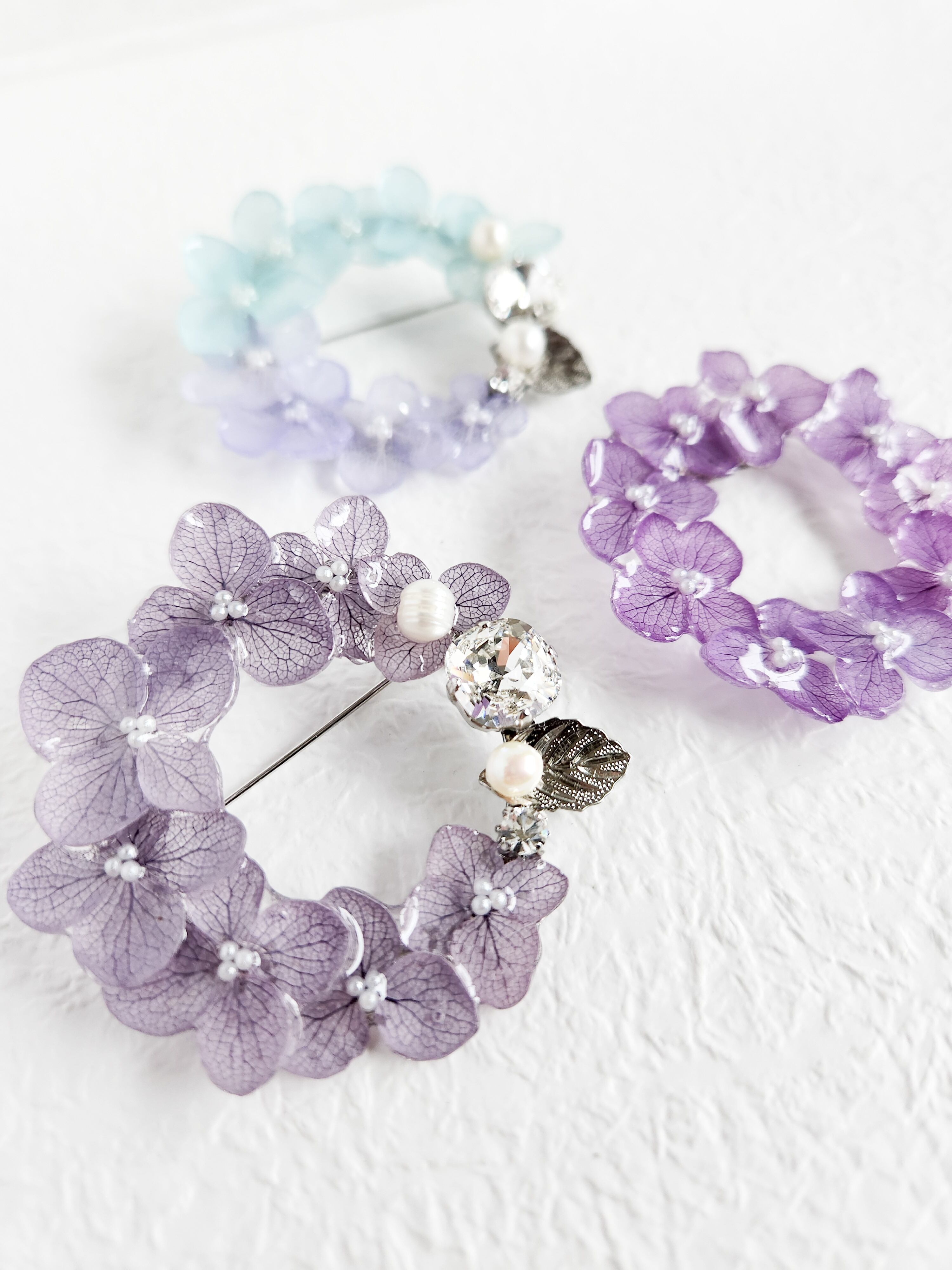 紫陽花の鮮やかな色と華麗な葉脈をまとったブローチで、あなたの日常を彩ってみませんか。