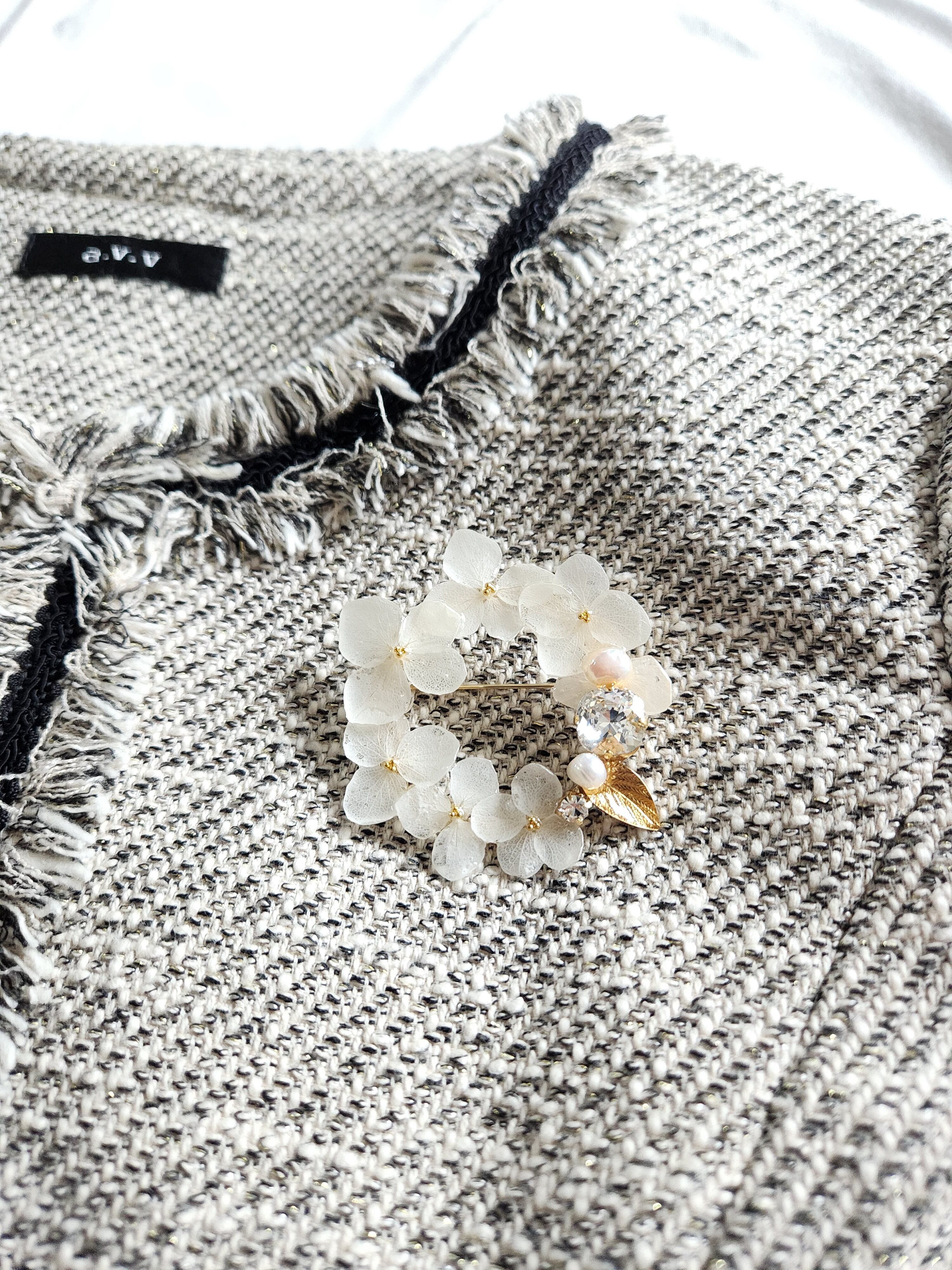 本物のお花(紫陽花)の花びらとクリスタルガラス(スワロフスキー)ビジュー、淡水パールを使ったブローチです。