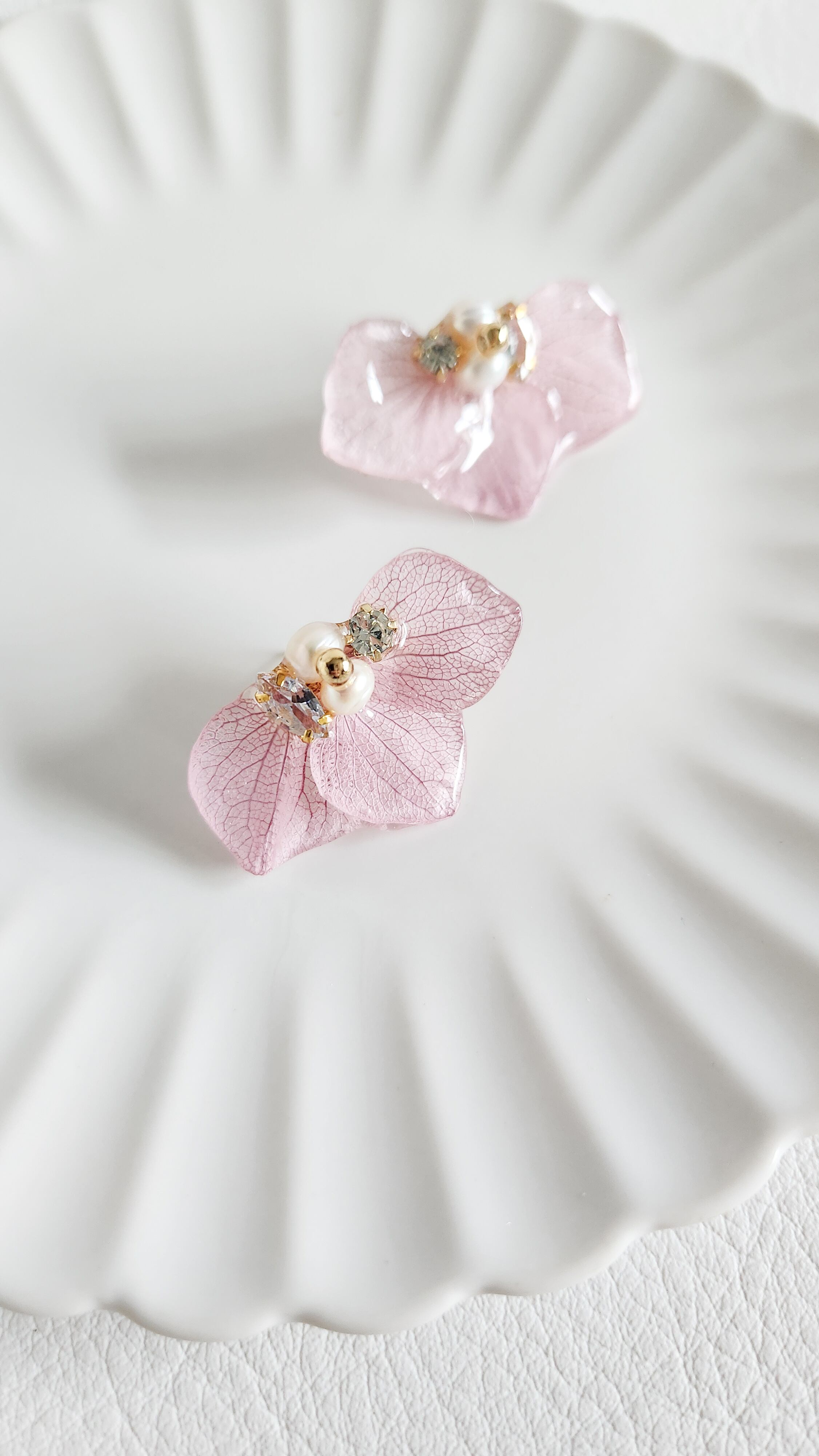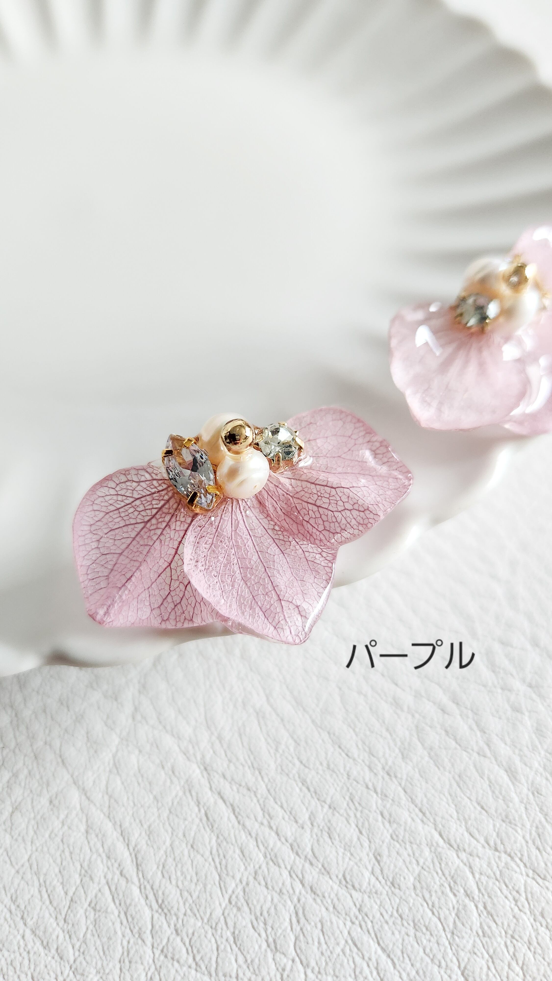 本物のお花(紫陽花)と淡水パール、クリスタル、ビジューを使用した耳飾りです。