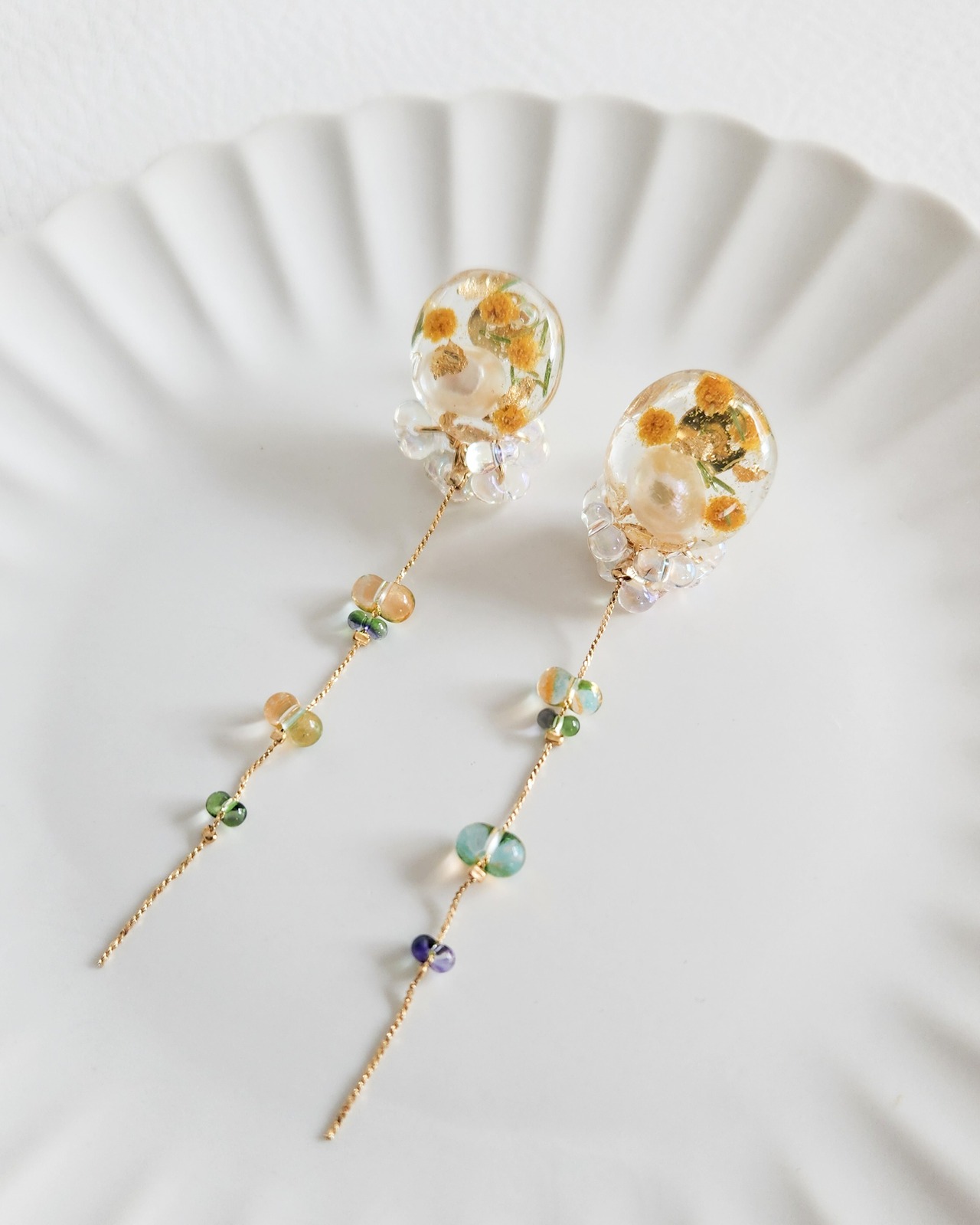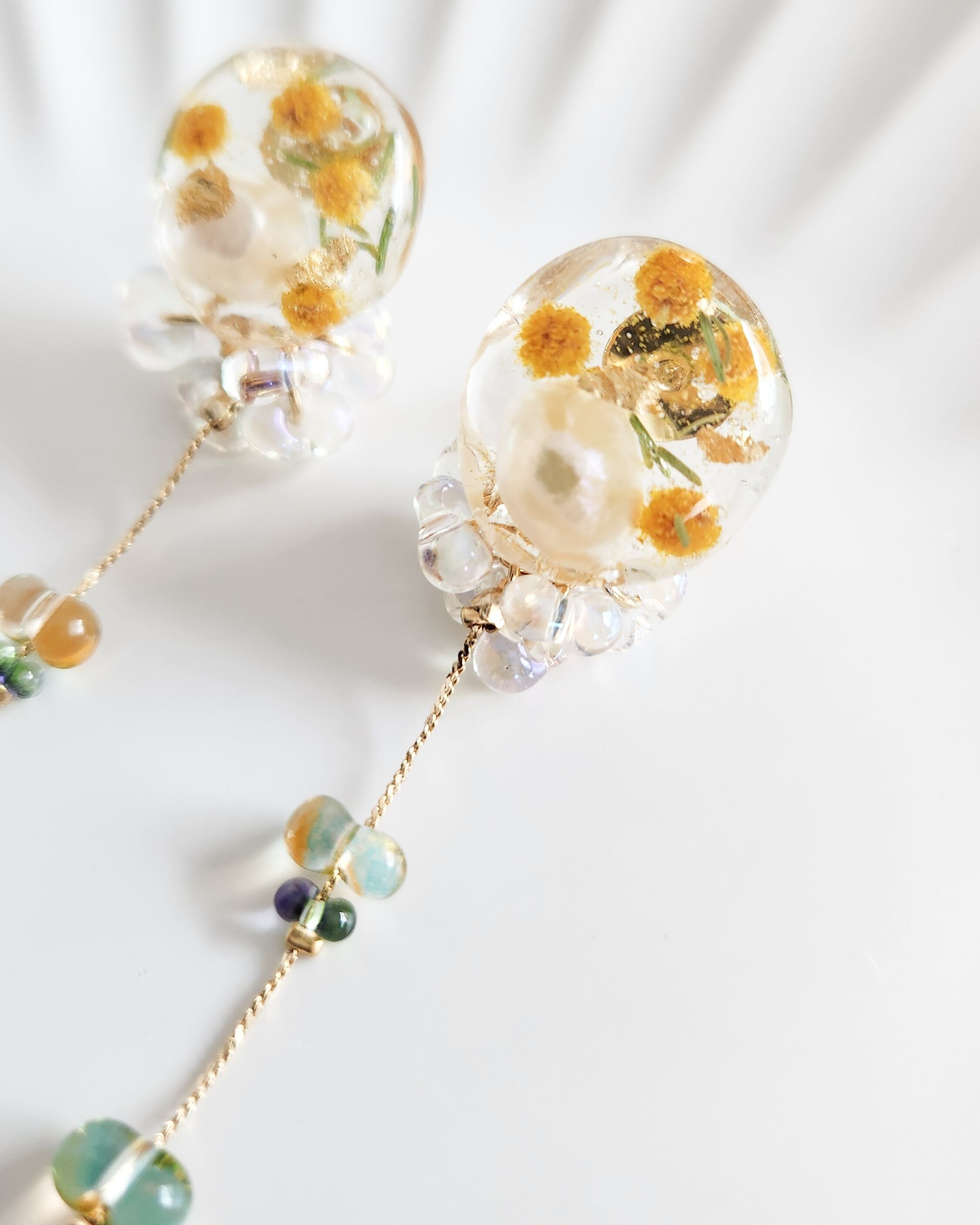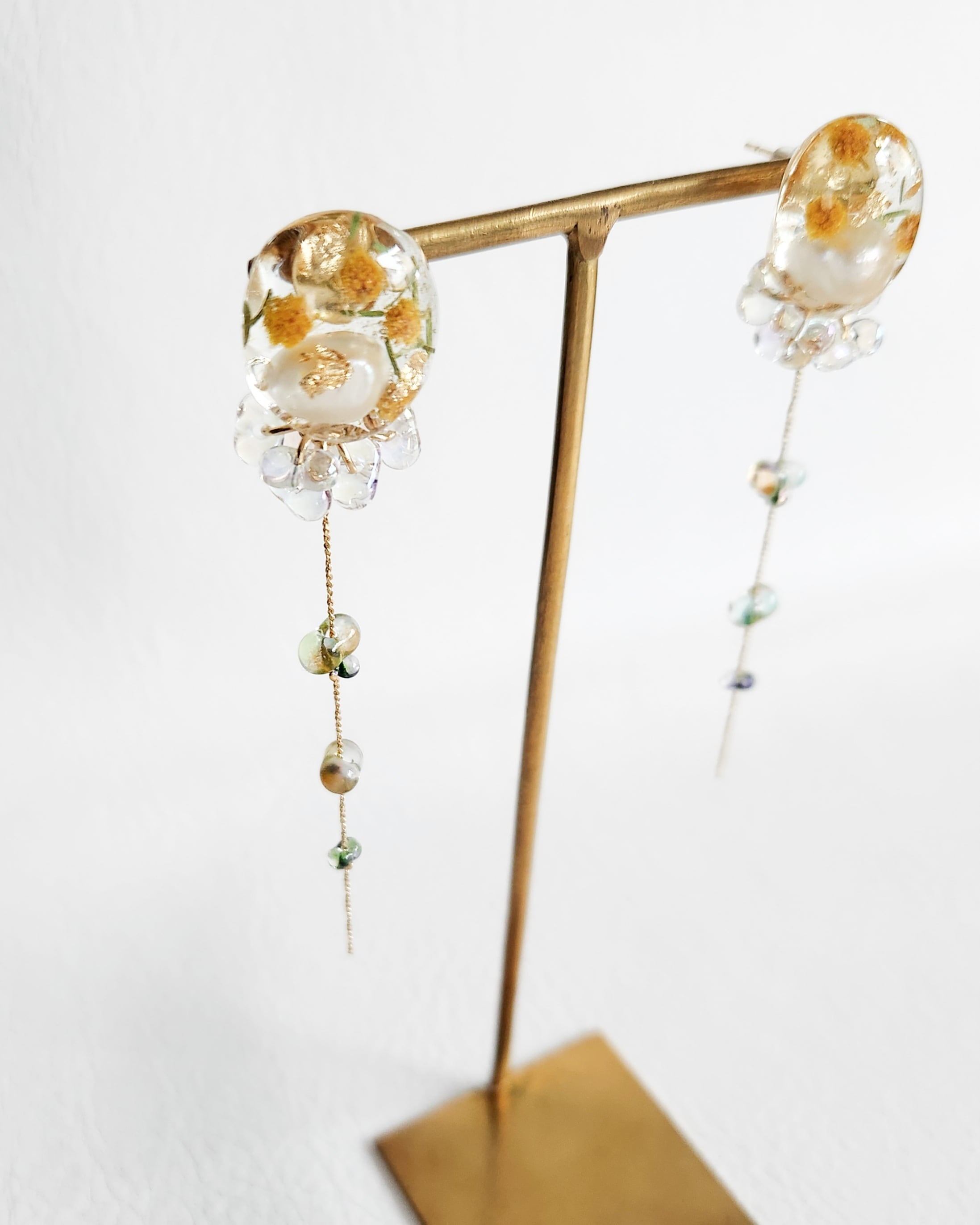 本物のお花(ミモザ)/淡水パール(約8~10mm)/チェコビーズ/樹脂/金具(メッキ)