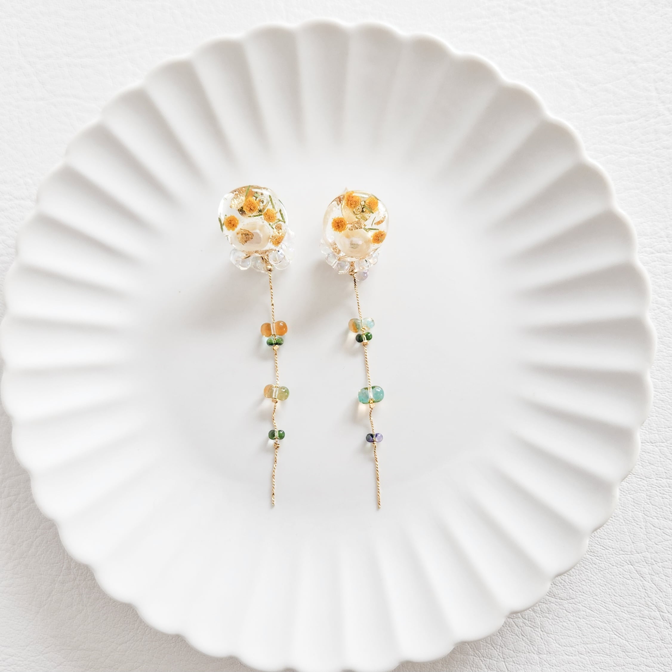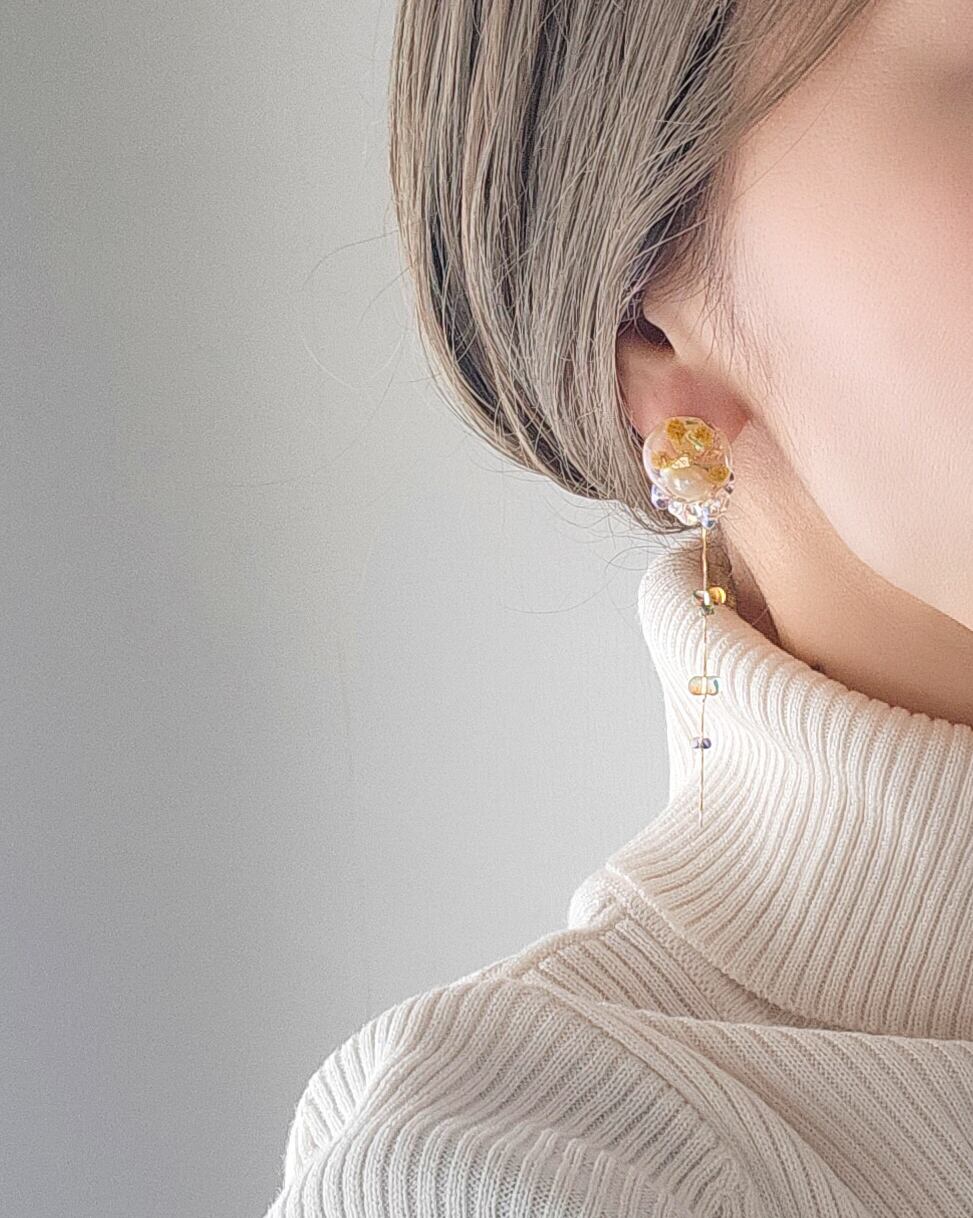 イタリア産のミモザを職人さんが丁寧にドライフラワーに加工し、ビタミンカラーの元気の出る耳飾りへと仕立てました♪
